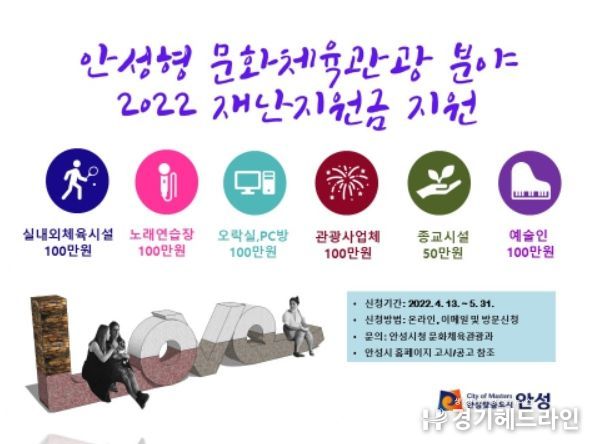 [경기헤드라인=인치덕 기자] 안성시는 코로나19로 경제적 어려움을 겪고 있는 지역 문화체육관광 분야에 대해 맞춤형 재난지원금을 지급한다고 밝혔다.
