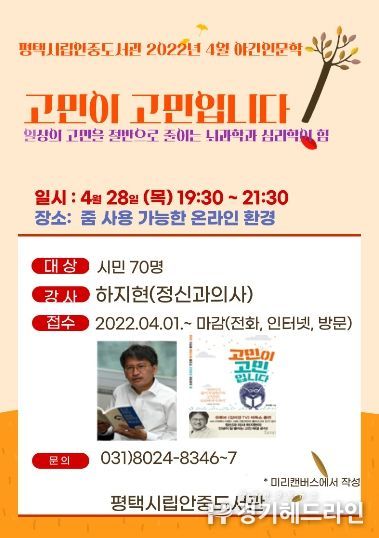 [경기헤드라인=인치덕 기자] 평택시립안중도서관은 2022년 4월 야간인문학 하지현 작가의 '고민이 고민입니다'를 운영한다.