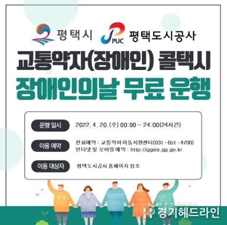 [경기헤드라인=인치덕 기자] 평택도시공사가 제42회 장애인의 날을 맞아 교통약자의 이동 편의를 제공하기 위해 4월 20일(수) 하루 동안 평택시 교통약자(장애인) 콜택시를 무료로 운행한다고 밝혔다.