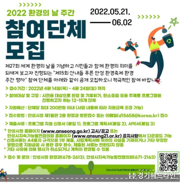 [경기헤드라인=인치덕 기자] 안성시는 오는 6월 5일 세계 환경의 날을 기념하고 시민들과 함께 환경보전의 의미를 되새기며 탄소중립 실천을 독려하고자 여는 ‘2022년 제15회 산내들 푸른 안성 환경축제’의 환경주간 행사 참여단체를 공개 모집한다고 밝혔다.