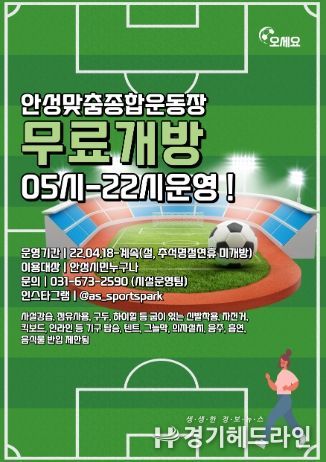 [경기헤드라인=인치덕 기자] 안성시시설관리공단은 오는 18일부터 안성맞춤종합운동장 시설 내 육상경기장(트랙) 및 인조잔디구장 무료개방 이용시간을 05 시부터 22시까지 확대한다.