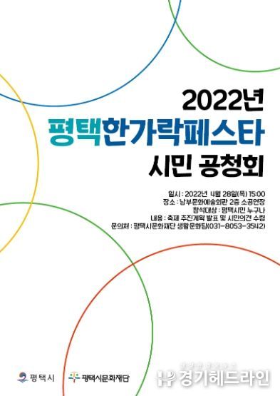 [경기헤드라인=인치덕 기자] 재단법인 평택시문화재단(대표이사 이상균)은 오는 4월 28일 15시부터, 남부문화예술회관 2층 소공연장에서 '2022년 평택한가락페스타 시민 공청회'를 개최한다고 밝혔다.