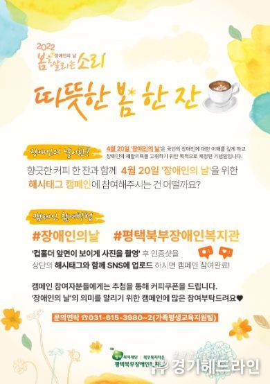 더불어 평택시 관내 카페에 배포된 컵홀더를 사용해주시는 지역주민을 대상으로 해시태그 캠페인을 진행하고 있다. 컵홀더 사용 인증샷을 찍어 ‘#평택북부장애인복지관’ 또는 ‘#장애인의 날’ 해시태그를 달고 SNS에 올려주면 캠페인에 참여할 수 있다. 캠페인 참여자에게는 추첨을 통해 커피 쿠폰을 증정할 예정이니 많은 관심과 참여 부탁드린다.