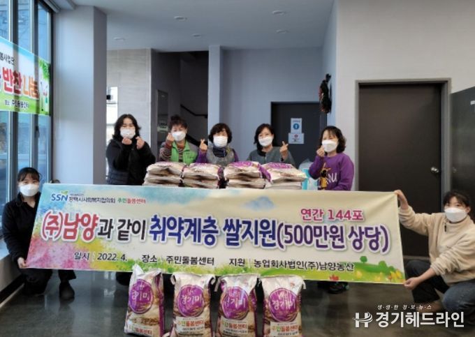 평택시 포승읍 소재 농업회사법인(주)남양농산은 경제적 어려움을 겪고 있는 이웃을 위해 2021년부터 매달 주민돌봄센터에 쌀10㎏ 12포를 기탁하고 있으며, 2022년 경기미 10㎏ 144포를 주민돌봄센터에 기탁했다.