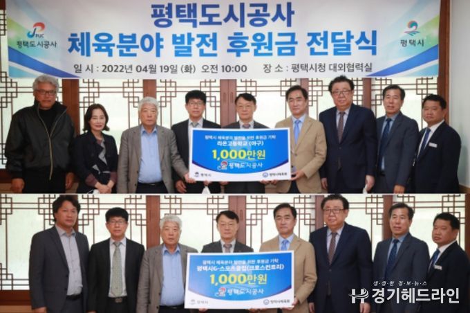 [경기헤드라인=인치덕 기자] 평택도시공사(사장 김재수)는 19일 평택시청 대외협력실에서 평택시 체육분야 발전 및 선수 육성을 위한 후원금 총 2,000만원을 기탁했다.