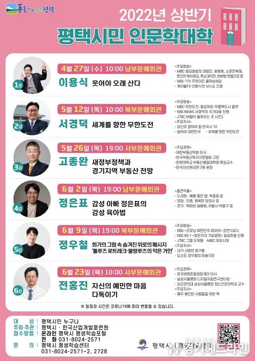 이번 2022년 평택시민인문학대학은 주간 6회, 야간 6회 진행되며, 제1강 이용식 개그맨의 ‘웃어야 오래 산다’ 강연을 시작으로, 12인의 초청 명사가 건강, 역사, 미술 등 다양한 주제로 삶의 지혜를 전달할 예정이다.