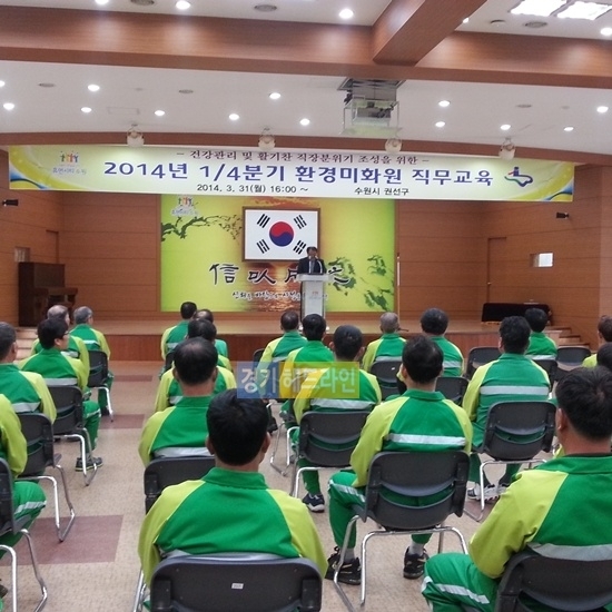 수원시 권선구(구청장 김지완)는 지난 31일 구청 대회의실에서 환경미화원 직무교육을 실시했다. 이날 교육은 김지완 권선구청장의 인사말을 시작으로 한국CS아카데미 소속 이용영 수석강사의 건강강의 및 청소팀장의 환경미화원 복무규정 교육 순으로 진행됐다.