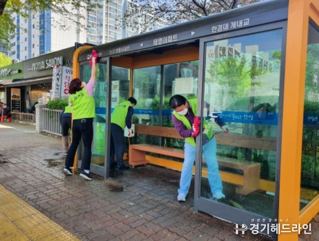 [경기헤드라인=인치덕 기자] 안성시 안성3동 통장단협의회는 지난 20일 관내 버스정류장의 묵은 때를 씻어내고자 물청소에 나섰다.