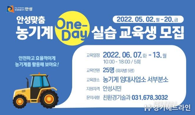 [경기헤드라인=인치덕 기자] 안성시농업기술센터는 오는 5월 2일부터 ‘농기계 원데이 교육’ 교육생을 모집한다.