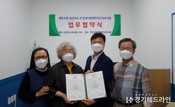 [경기헤드라인=인치덕 기자] 26일 협동조합 빛공작소(대표 전경옥)와 안성시장애인주간보호시설(원장 임학록)은 지역 내 성인 발달장애인들의 공동체 문화 역량을 강화하는데 기여하기 위하여 업무협약(MOU)을 체결했다.