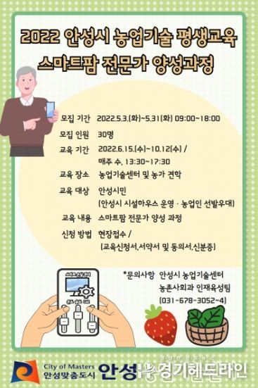 [경기헤드라인=인치덕 기자] 안성시농업기술센터에서는 오는 5월 3일부터 5월 31일까지 농업기술평생교육 스마트팜 전문가 양성과정 교육생을 모집한다.