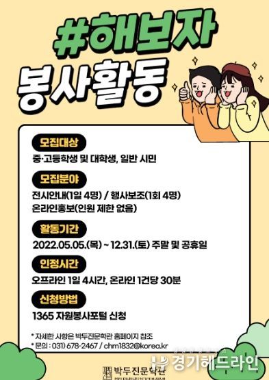모집 분야는 △전시안내 △행사보조 △온라인홍보로, 주말 및 공휴일 중 원하는 날짜를 선택해 신청할 수 있다. 전시안내와 행사보조는 1일 4명으로 인원을 제한하며, 온라인홍보는 인원 제한 없이 운영한다.