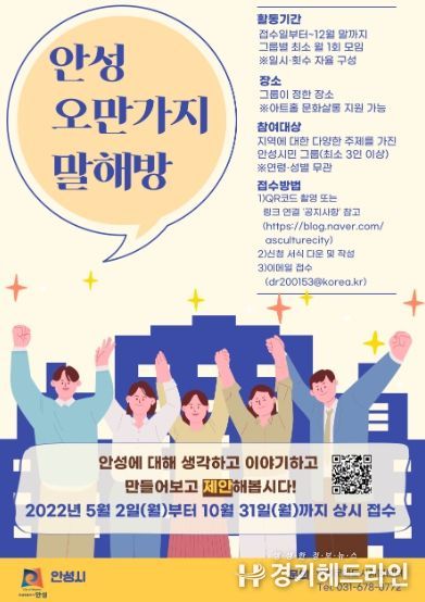 [경기헤드라인=인치덕 기자] 안성시는 안성시에 대한 다양한 이야기를 나누는 시민 모임인 ‘오만가지말해방’의 참여 신청을 오는 5월 2일부터 10월 31일까지 상시 접수한다.