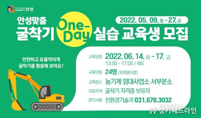 [경기헤드라인=인치덕 기자] 안성시농업기술센터는 오는 5월 9일부터 굴착기 원데이 교육생을 모집한다고 밝혔다.