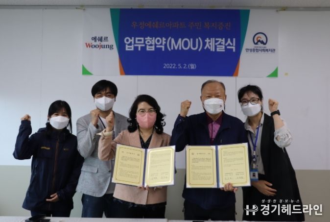[경기헤드라인=인치덕 기자] 안성종합사회복지관(관장 장은순)과 안성 우정에쉐르아파트(관리소장 김민종)는 지난 5월 2일 협력관계를 형성해 주민의 복지 증진을 위한 업무협약을 체결했다.