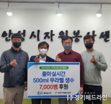 [경기헤드라인=인치덕 기자] ㈜물마실시간(대표이사:김은배)이 안성시 지역사회 공헌을 위한 무라벨생수 7,000개를 안성시자원봉사센터에 기탁했다.