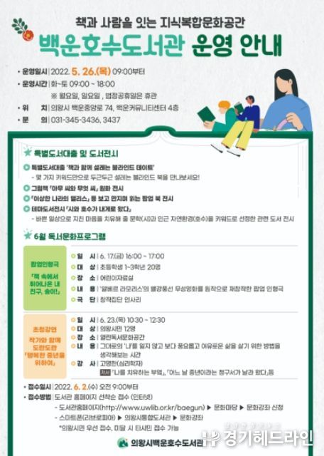 운영 시작을 기념해 5월 26일부터 블라인드 도서대출, 팝업북 전시, 그림책 원화전시 등을 운영하며, 6월 17일에는 어린이를 위한 팝업인형극 ‘책 속에서 튀어나온 내 친구 송이’, 6월 23일에는 고명한 심리학자의 ‘행복한 중년을 위하여’ 강연이 진행될 예정이다. 6월 프로그램 접수는 6. 2.(목)부터 백운호수도서관 홈페이지에서 가능하다.