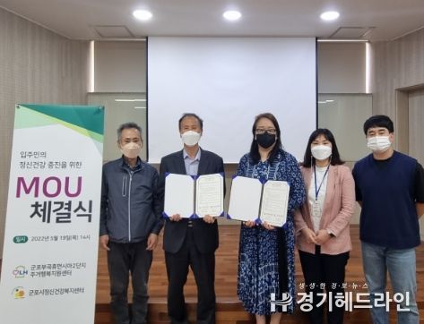 [경기헤드라인=문수철 기자] 군포시 정신건강복지센터 부설 자살예방센터는 최근 군포 부곡휴먼시아2단지 주거행복지원센터와 입주민들의 정신건강과 생명존중 문화조성을 위한 업무협약을 체결했다.