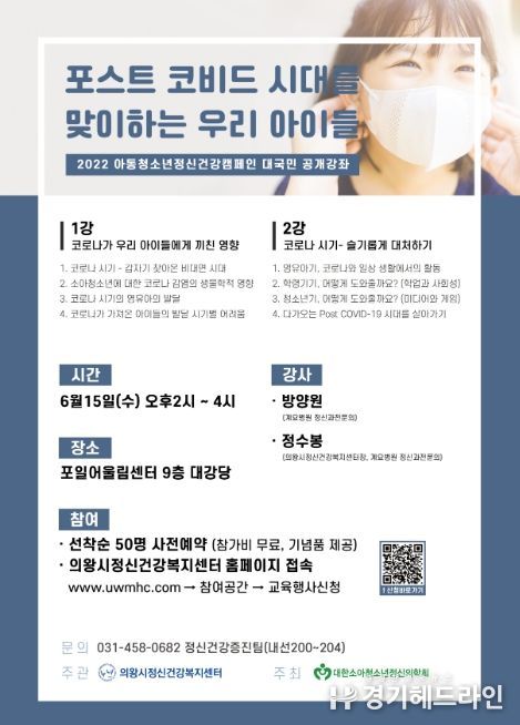 [경기헤드라인=문수철 기자] 대한소아청소년정신의학회에서 주최하고 의왕시정신건강복지센터에서 주관하는 아동청소년 정신건강 대국민강좌가 6월 15일 수요일 의왕시 포일어울림센터에서 개최된다.