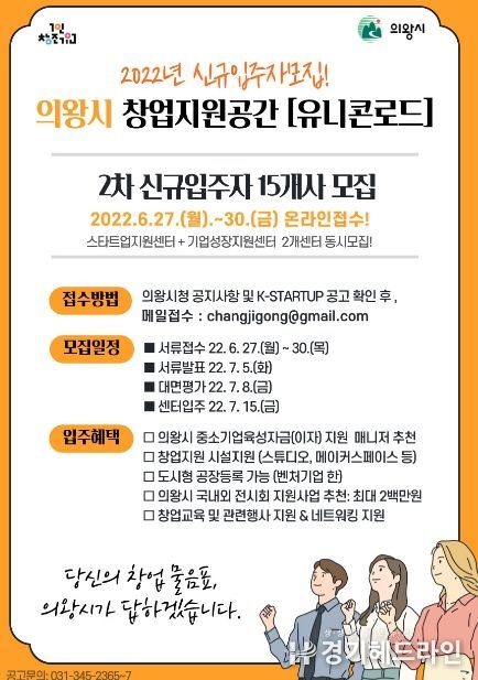 [경기헤드라인=문수철 기자] 의왕시 창업지원공간에서 유니콘 기업을 육성하기 위한 신규 입주기업 모집을 진행한다고 9일 밝혔다.