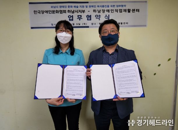 [경기헤드라인=김성구 기자] 사단법인 한국장애인문화협회 하남시지부와 사회복지법인 무형복지재단에서 운영하는 하남장애인직업재활센터는 지난 6월 9일 목요일 11시에 하남장애인직업재활센터 회의실에서 업무협약(MOU)을 체결했다.