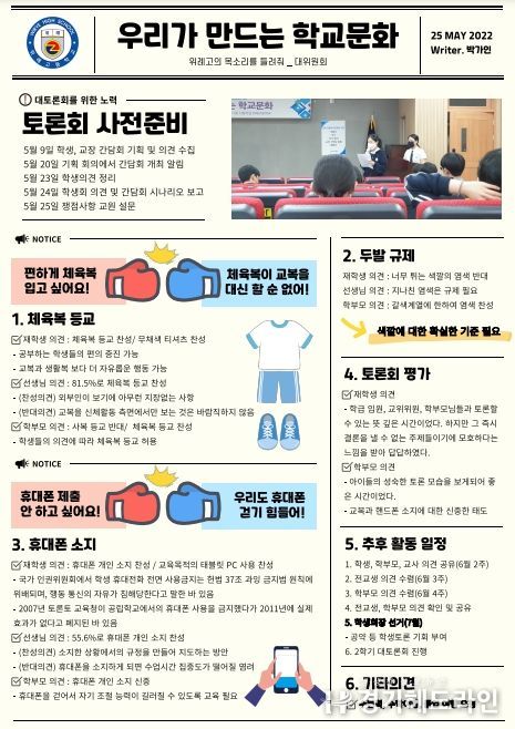 [경기헤드라인=문수철 기자] 광주하남교육지원청 위례고등학교는 지난 5월 25일, ‘우리가 만드는 학교문화’를 주제로 교사와 학생, 학부모가 참여한 교육공동체 대토론회를 진행했다. 올해 4월 18일 거리두기가 해제됨에 따라 2년 만에 대면으로 진행된 회의는 민주시민 교육의 장이 되기에 충분했다.