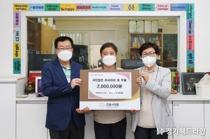 [경기헤드라인=문수철 기자] 군포시의회가 지역 내 다문화 가정의 행복 돌봄에 기여하기 위해 아시아의창어린이집에 200만원의 성금을 기부했다.