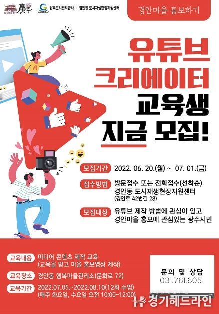 [경기헤드라인=김성구 기자] 광주시는 뉴미디어 1인 크리에이터로 활동하며 직접 경안동 도시재생활성화지역을 홍보하는 콘텐츠를 제작할 유튜브 크리에이터 교육생을 오는 7월 1일까지 모집한다.