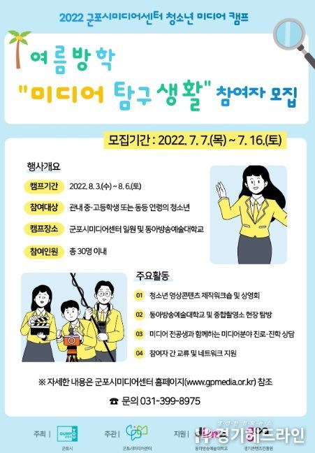[경기헤드라인=문수철 기자] 군포시미디어센터는 동아방송예술대학교와 함께 오는 8월3일(수)부터 8월4일(토)까지 4일간 ‘2022년 군포시미디어센터 청소년 미디어 캠프(캠프명 : 여름방학, 미디어 탐구생활)’를 실시한다고 밝혔다.