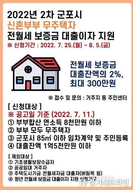 [경기헤드라인=문수철 기자] 군포시는 신혼부부의 주거 마련 부담 증가로 인한 혼인인구 감소와 저출산 문제를 해소하기 위해 '2022년 신혼부부 무주택자 전월세 보증금 대출이자 지원사업'2차 대상자를 모집한다.