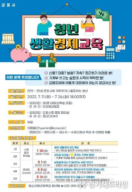 [경기헤드라인=문수철 기자] 군포시는 2030세대들의 합리적인 경제활동 능력 향상과 재무설계를 위해 ’청년 생활경제 교육’을 실시한다고 밝혔다.