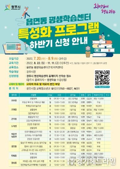 [경기헤드라인=김성구 기자] 광주시는 오는 20일부터 8월 9일까지 3주간 2022년 하반기 읍‧면‧동 평생학습센터 특성화 프로그램 학습자를 모집한다고 15일 밝혔다.