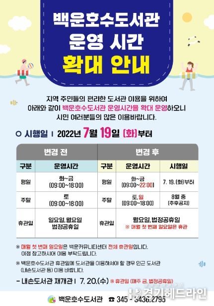 시에서는 지역 주민들의 편의를 증진하고 도서관 이용률을 높이기 위해 7월 19일부터 평일 운영시간을 기존 ‘9시부터 18시’에서 ‘9시부터 22시’로 확대하기로 결정했다.