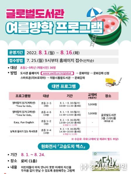 [경기헤드라인=문수철 기자] 의왕시 글로벌도서관은 오는 8월 1일부터 8월 16일까지 관내 초등학생을 대상으로 여름방학 프로그램을 운영한다.