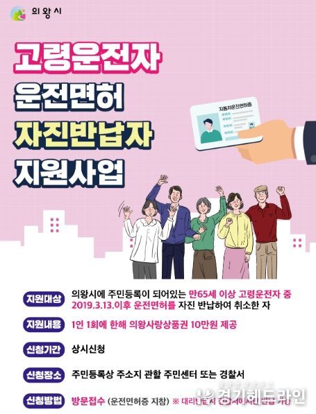 고령운전자 운전면허 자진반납 지원사업은 의왕시에 주소를 두고 운전면허를 가진 만65세 이상은 누구나 신청할 수 있으며, 주민등록상 주소지 주민센터 또는 경찰서를 방문해 면허를 반납한 사람에게는 1회에 한하여 의왕사랑상품권 10만원을 지급한다.