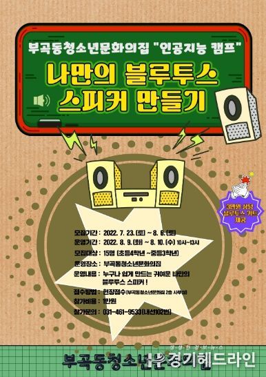 8월 9일부터 10일까지 2일간 운영하는 인공지능 캠프 ‘나만의 블루투스 스피커 만들기’는 부곡동청소년 문화의집 특화사업인 ‘모아메이커 랩’사업의 하나로, 청소년들이 과학·발명에 대해 쉽게 이해하고 창의적 사고능력을 증진시켜 창의융합인재로 성장을 돕기 위해 마련됐다.