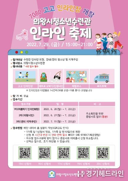 [경기헤드라인=문수철 기자] 의왕시청소년수련관은 생활체육 행사의 일환인 ‘인라인축제’가 29일 금요일 오후 3시 개최된다고 밝혔다.