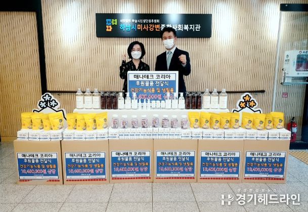 [경기헤드라인=김성구 기자] 글로벌 웰니스 기업 (유)매나테크코리아(대표 노재홍)가 지역사회 이웃들을 위해 하남시미사강변종합사회복지관(관장 조혜연)에 1,840만원 상당의 후원 물품을 전달했다.
