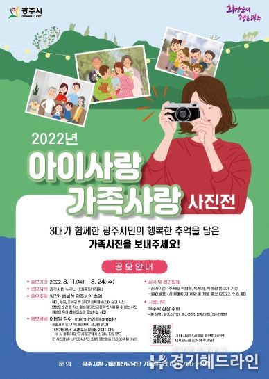 [경기헤드라인=김성구 기자] 광주시는 저출산 문제를 시민과 함께 고민하고 인구 친화적인 사회분위기 조성에 기여하기 위해 오는 11일부터 24일까지 '2022년 아이사랑가족사랑 사진공모전'을 개최한다고 밝혔다.
