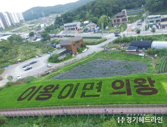 백운호수 근처 학의동 500번지 일대에 조성된 벼아트는 ‘U-덕분에♥’, ‘이왕이면 의왕’을 자색벼, 적색벼 등 다양한 색깔 벼로 표현해 도심 속 농촌경관이 조화를 이룬 모습이 장관을 이루고 있다.