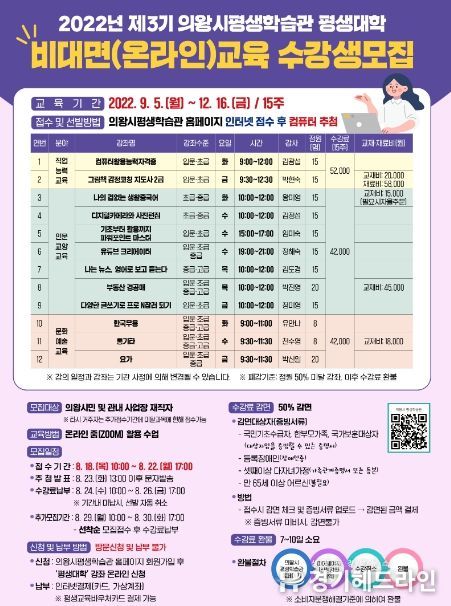 [경기헤드라인=문수철 기자] 의왕시가 오는 8월 18일부터 8월 22일까지 2022년 제3기 평생대학 비대면(온라인)교육 수강생을 모집한다고 밝혔다.