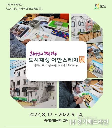 [경기헤드라인=김성구 기자] 광주시는 송정동 우전께 도시재생 활성화 지역에 위치한 송정 문화센터에서 오는 17일부터 9월 14일까지 4주간 희망도시 행복광주 ‘도시재생 어반스케치展 -그려봄’ 전시회를 개최한다고 11일 밝혔다.