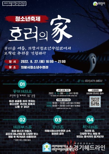 [경기헤드라인=문수철 기자] 의왕시청소년수련관은 오는 8월 27일 토요일 오후 5시부터 9시까지 관내청소년 및 지역주민들을 대상으로 청소년축제‘호러의 가’를 개최한다고 밝혔다.