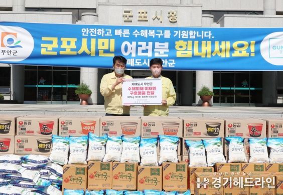 16일 군포시의 자매도시인 전남 무안군은 수해 소식을 접하고 쌀, 컵라면, 화장지 등 총 600만원 상당의 구호물품을 직접 실어와 이재민 임시 거주시설 관계자에게 전달했다.