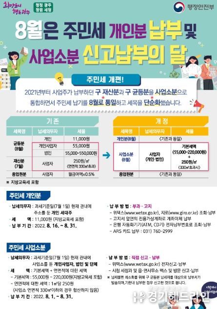 7. 1. 현재 주소를 기준으로 광주시에서 부과하는 주민세(개인분) 세대별 납부액은 11,000원(주민세 10,000원, 지방교육세 1,000원)이며, 대상은 약 13만건으로 8월31일까지 납부해야 한다.