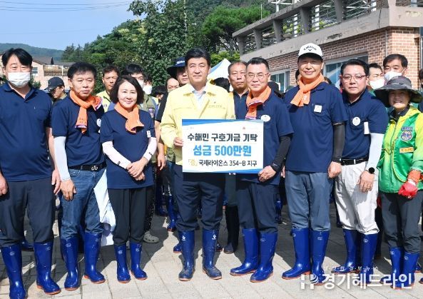 [경기헤드라인=김성구 기자] 국제라이온스 354-B지구는 지난 18일 광주시 수해복구를 위한 성금 500만원을 기부하고 광주라이온스와 함께 자원봉사자 80명과 남한산성면 검복리에서 토사물제거, 침수주택가구 청소 등 수해복구에 힘을 보탰다.