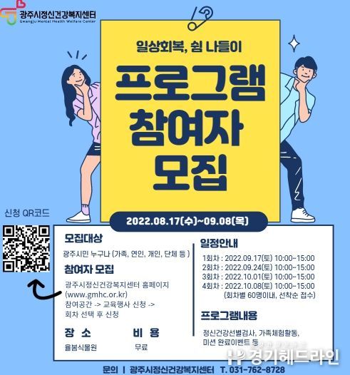 프로그램 참여 신청은 9월8일까지 광주시정신건강복지센터 홈페이지를 통해 누구나 가능하며, 궁금한 사항은 광주시정신건강복지센터로 문의하면 된다.