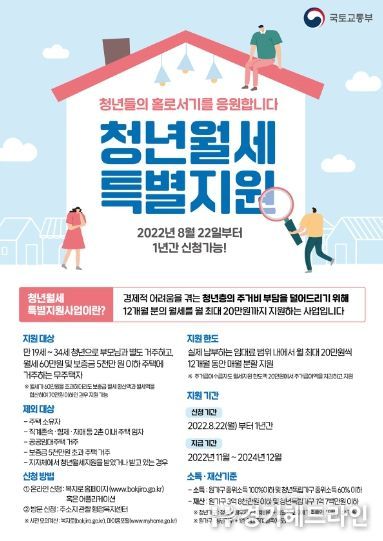 이번 사업은 코로나19 장기화로 경제적 어려움을 겪는 청년층의 주거비 부담을 덜어주기 위해 정부가 한시적으로 추진하는 사업으로, 오는 22일부터 2023년 8월 21일까지 1년간 신청이 가능하다.