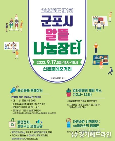 [경기헤드라인=문수철 기자] 오는 9월 17일 ‘2022년 제1회 군포시 알뜰나눔장터’가 산본 로데오거리에서 열린다.