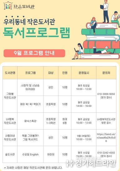▲그랑블작은도서관에서는 ‘시창작 및 시낭송 아카데미’(매주 토요일 10시), ‘재미 쑥! 쑥! 책 읽기’(매주 금요일 14시)를 ▲행복작은도서관에서 ‘파닉스특강’(매주 금요일 10시)을 운영한다. 또한 ▲사통이네작은도서관에서 ‘책을 그려볼까? 그림 독서카드’(9. 24. 10시)를 ▲숲도서관에서는 ‘수요일English’(매주 수요일 15시)를 운영할 예정이다. 자세한 사항은 의왕시 도서관 홈페이지를 통해 확인할 수 있다.